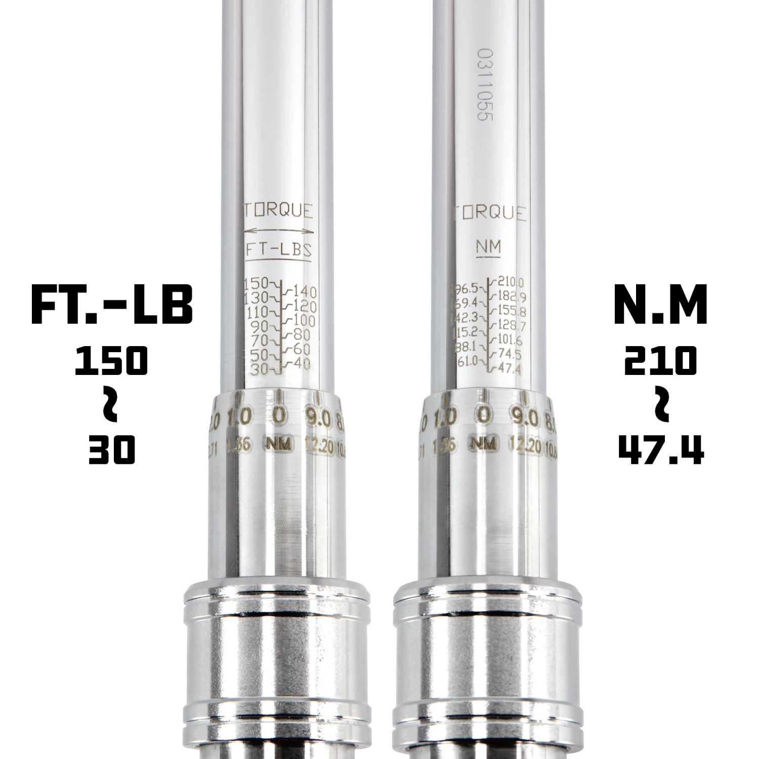 Dual Scale Torque Wrench Has A Range Of 30-150 Ft-Lbs / 30-210 Nm. Tear Drop Head With 32-Tooth Mechanism. Chrome Plated Aluminum Handle With Blow Mold Case. Wrench Comes With Blow Mold Case.