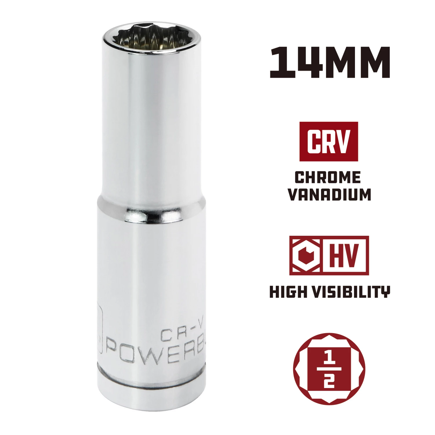 - Powerbuilt chrome sockets feature HV high visibility size markings that are three times larger for easy size selection.