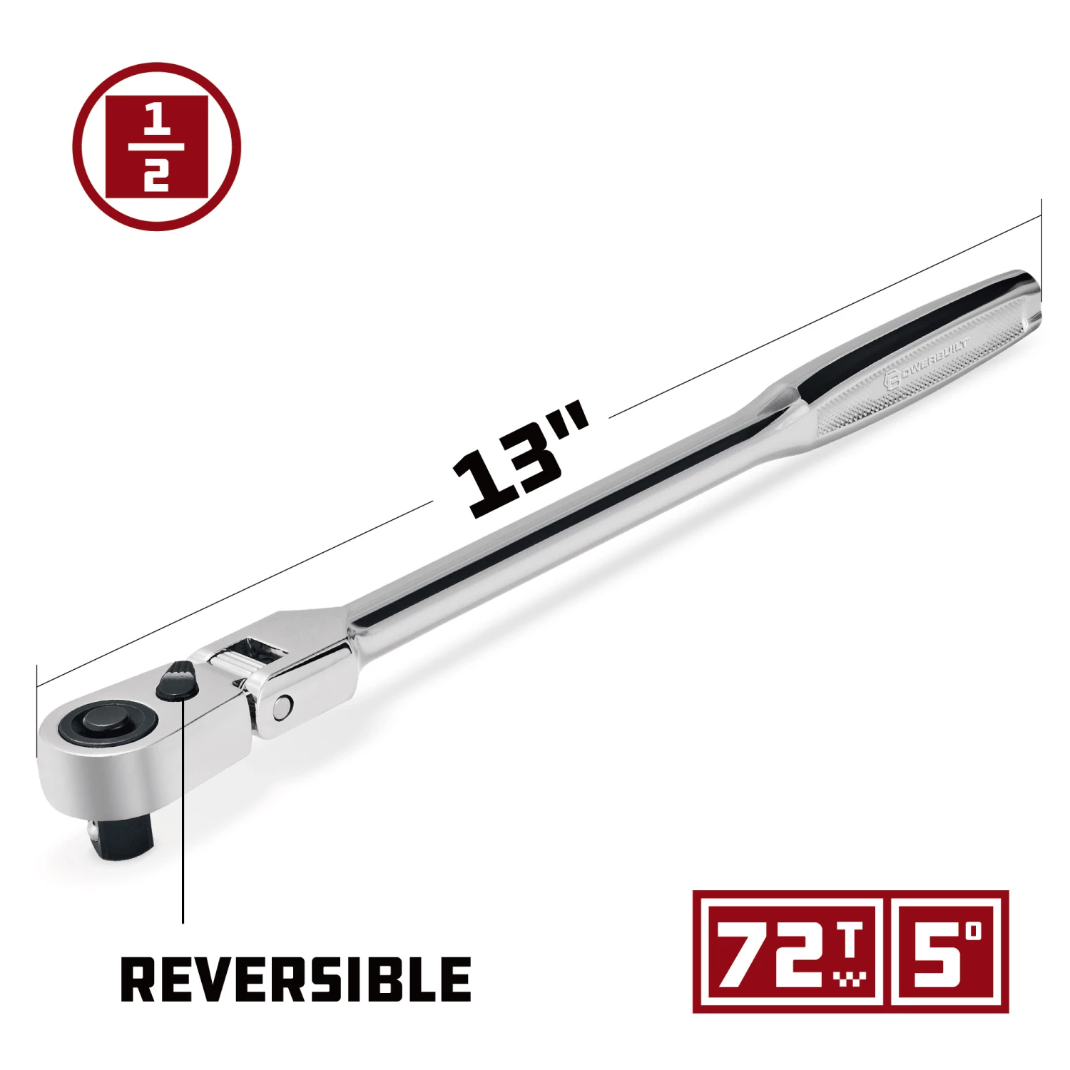 Powerbuilt 1/2 Inch Drive 72 Tooth Pro Tech 13 Inch Long Reach Flex Head Ratchet with Contour Handle – 649954