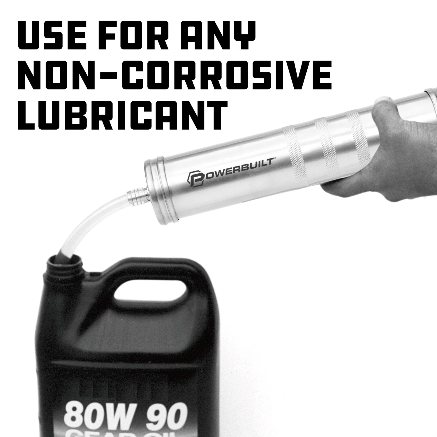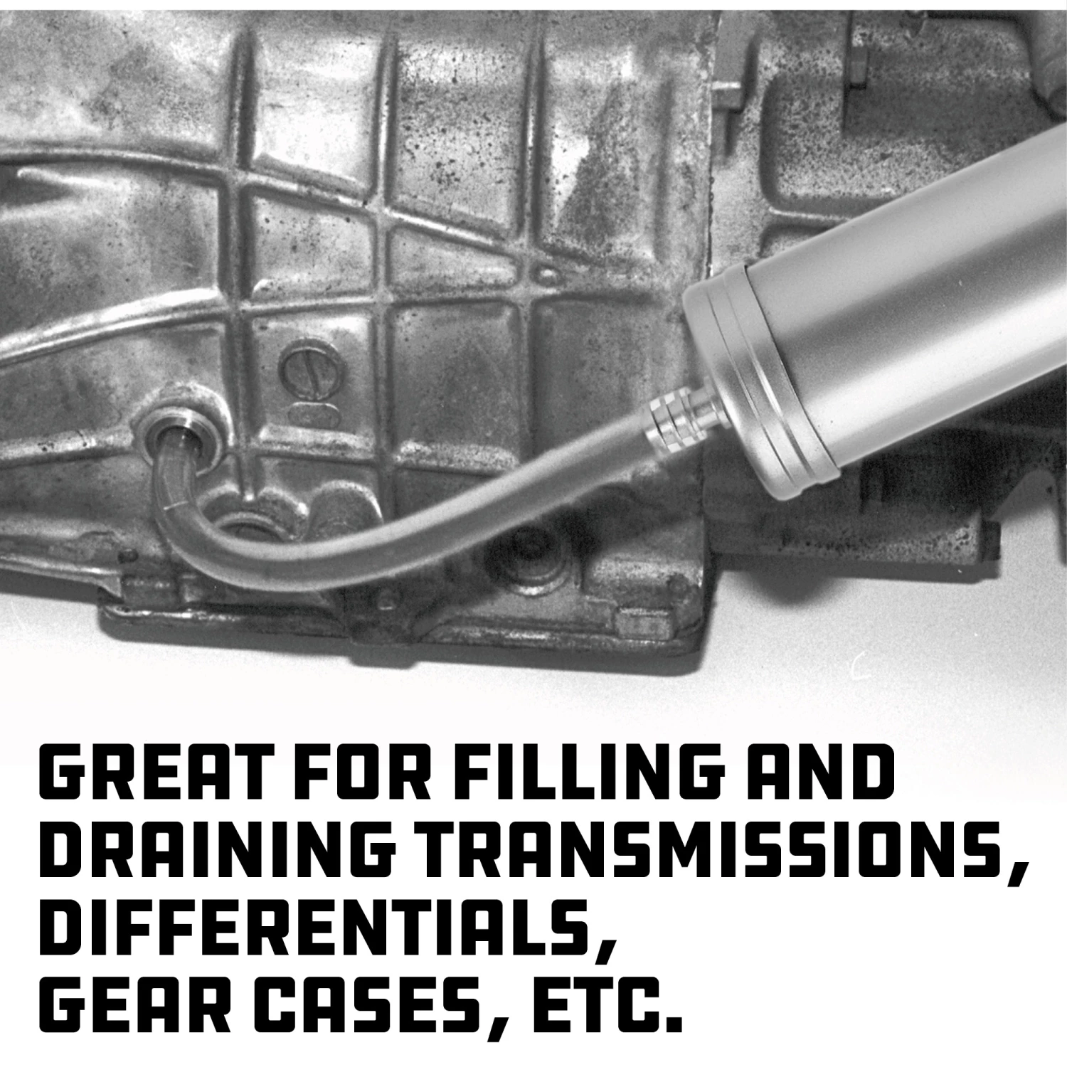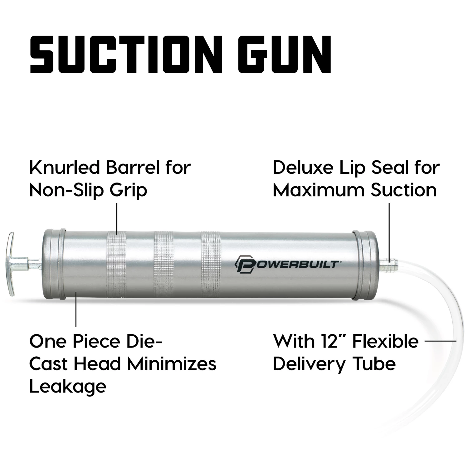 For filling and draining transmissions, differentials, gearcases, etc. Includes 12″ flexible delivery tube. Knurledbarrel for non-slip grip. One piece die cast headminimizes leakage. Deluxe lip seal for maximum suction.Use with any non-corrosive lubricant.