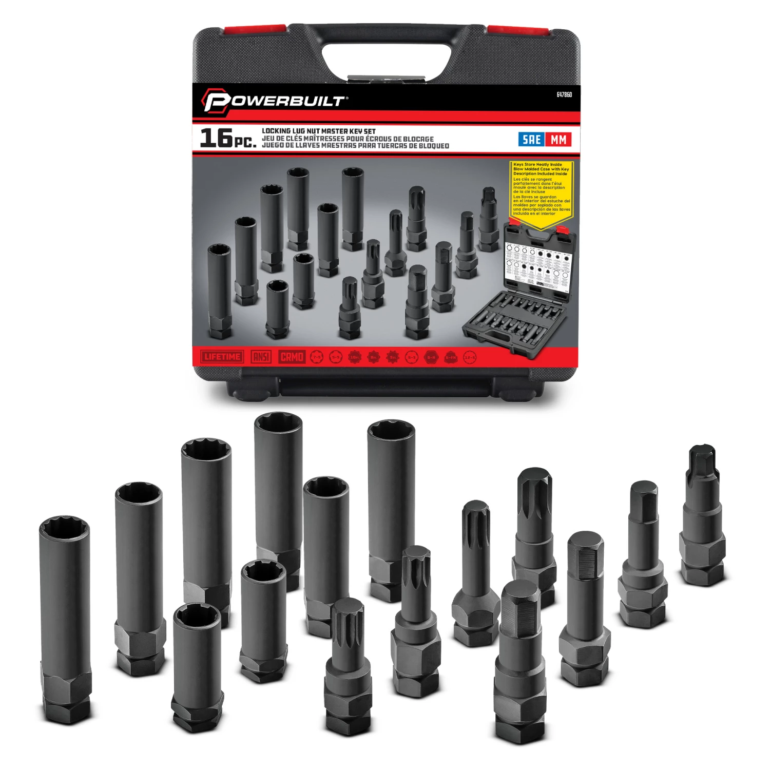 Remove most factory and aftermarket locking lug nuts with this master socket set. Each socket is constructed of impact-rated chromoly steel for use with an impact wrench. each socket is labeled with the size and style of locking lug nut for easy reference. The included storage case makes it easy to keep your sockets safe, clean and organized. And the inside case lid includes a handy socket reference chart.