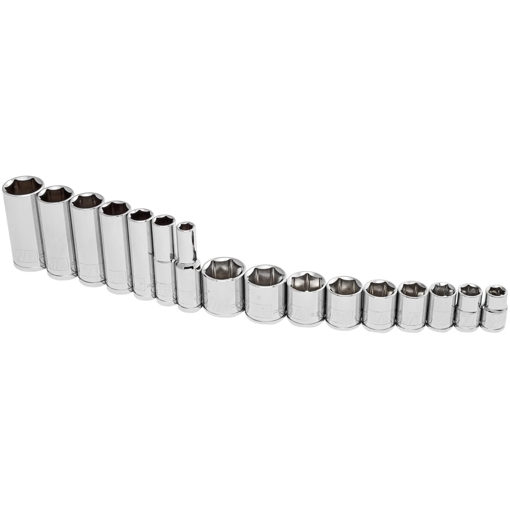 The Powerbuilt 14 piece 3/8″ Dr. SAE 6 point socket set includes: shallow sockets: 3/8″, 7/16″, 1/2″, 9/16″, 5/8″, 11/16″, 3/4″, 13/16″, 7/8″; deep sockets: 5/16″, 7/16″, 1/2″, 5/8″, 11/16″, 3/4″, 7/8″