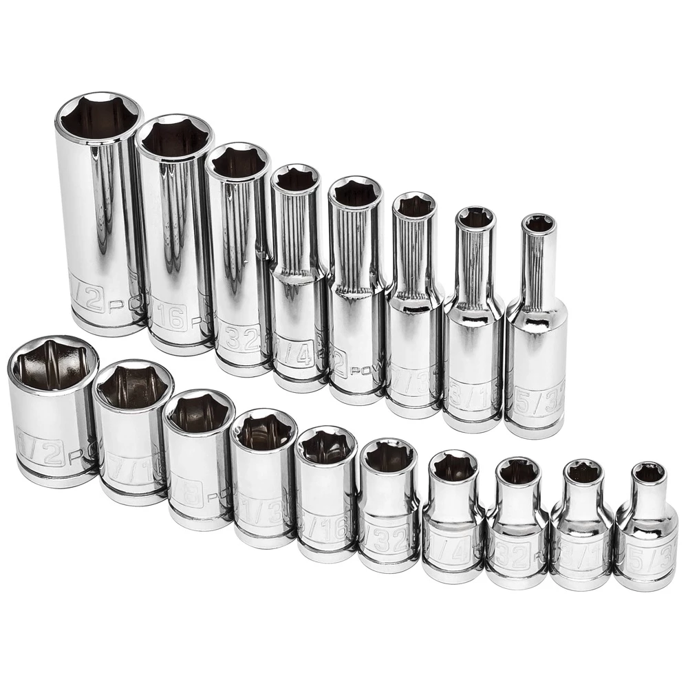 The Powerbuilt 18 piece 1/4″ Dr. SAE 6 point socket set includes: shallow sockets: 5/32″,3/16″, 7/32″,1/4″, 9/32″, 5/16″,11/32″, 3/8″, 7/16″, 1/2″; deep sockets: 5/32″, 3/16″, 7/32″, 1/4″, 9/32″, 11/32″, 7/16″, 1/2″.