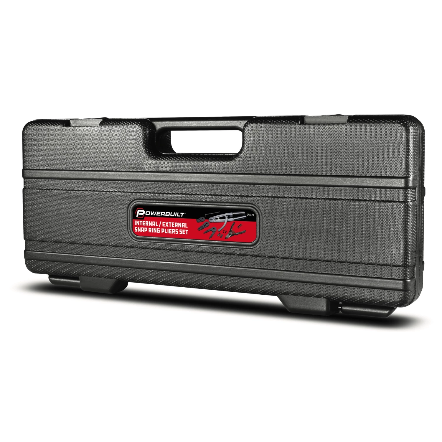 You can quickly and easily remove and install a wide range of snap-rings and piston rings with the Powerbuilt 2 Piece Snap-Ring Piston Ring Pliers Set. This handy set features heavy-duty 16-inch pliers ideal for large equipment servicing. These jumbo pliers feature interchangeable jaws for internal and external snap rings and piston rings. And the jaws lock in place to securely hold rings open. For smaller jobs, reach for the 7-inch pliers. They feature a unique flip switch so that you can change pliers’ function from internal to external mode in just seconds. It includes straight and 90 degree tips for added versatility. Pliers set comes in a heavy-duty case for safe storage and easy access.