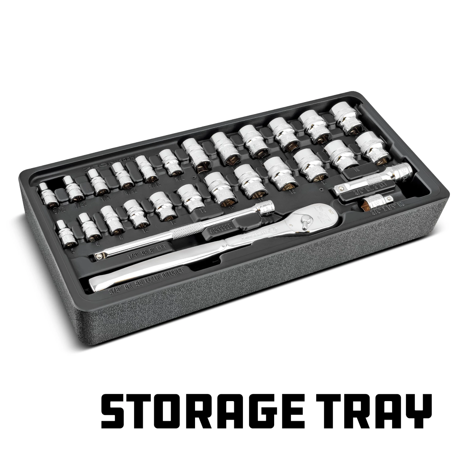 The Powerbuilt 28 Piece Zeon socket set combines the most commonly used SAE and metric socket sizes. Each socket features the patented Zeon design. Powerbuilt Zeon sockets are designed to grip and turn damaged and rounded nuts and bolts. The patented design will grip and turn hex heads up to 85% rounded. And they work just as well on new nuts and bolts. The secret is the patented Zeon socket design – the more you turn them the harder they grab and hold damaged hex heads. Zeon sockets are heat-treated to hardness HRC 38-56 for maximum strength and durability. And you’ll drive the sockets with strength and precision using the included 90 tooth Powerbuilt XT90 ratchet. This sealed head professional grade ratchet is the most durable ratchet in the Powerbuilt line. It requires just a 4-degree swing to engage the ratchet, making it ideal for the tightest spaces in the engine bay.