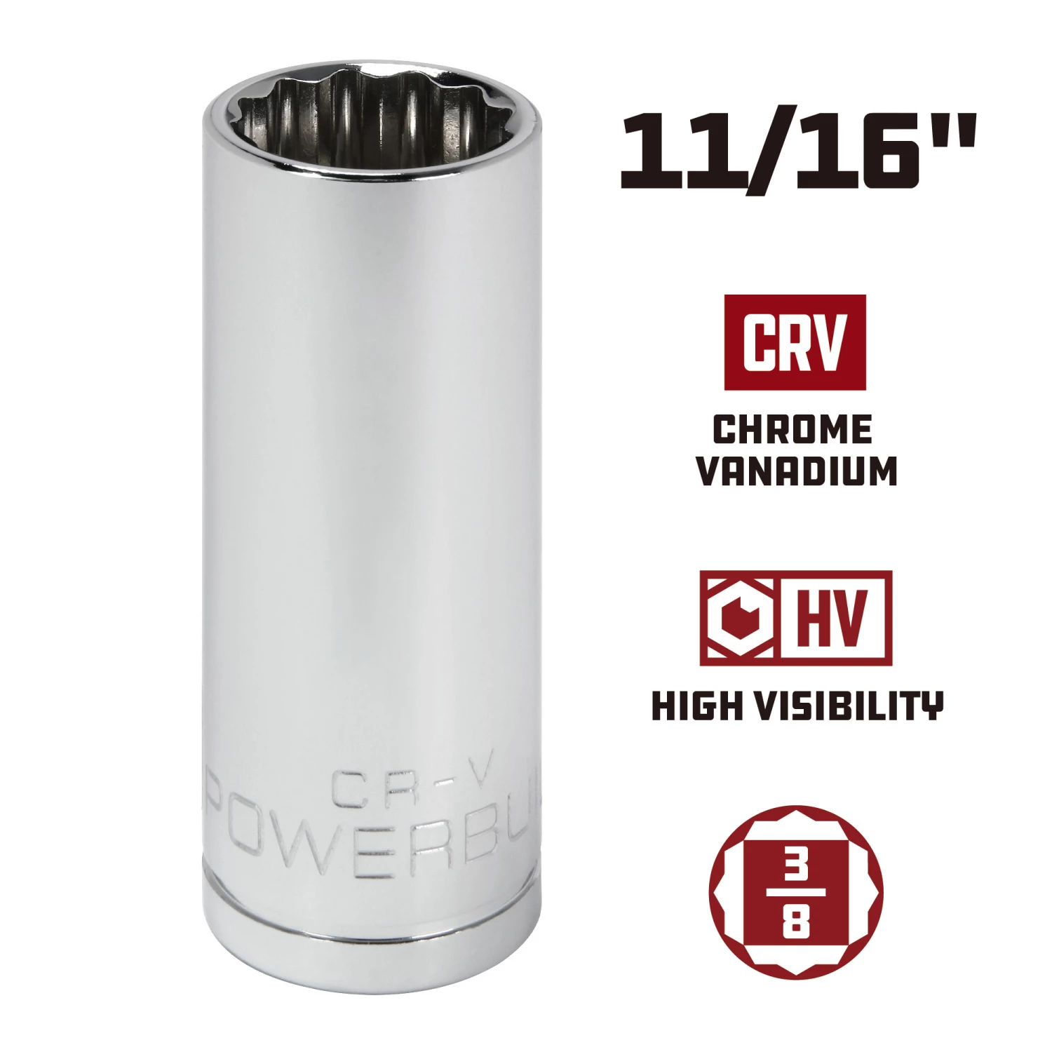 - Powerbuilt chrome sockets feature HV high visibility size markings that are three times larger for easy size selection.