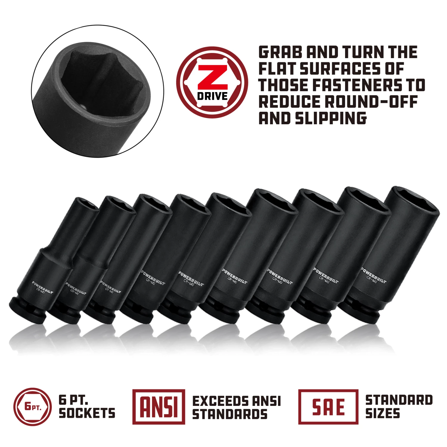 Powerbuilt Impact Sockets and accessories feature an industrial grade Black Phosphate finish that prevents corrosion and extends the life of the tool. Each socket is made from Chrome Vanadium steel material for added durability. Powerbuilt impact sockets all use 6 point broaching configuration for increased strength and, each Powerbuilt impact socket and accessory exceeds ANSI standards for performance and quality.