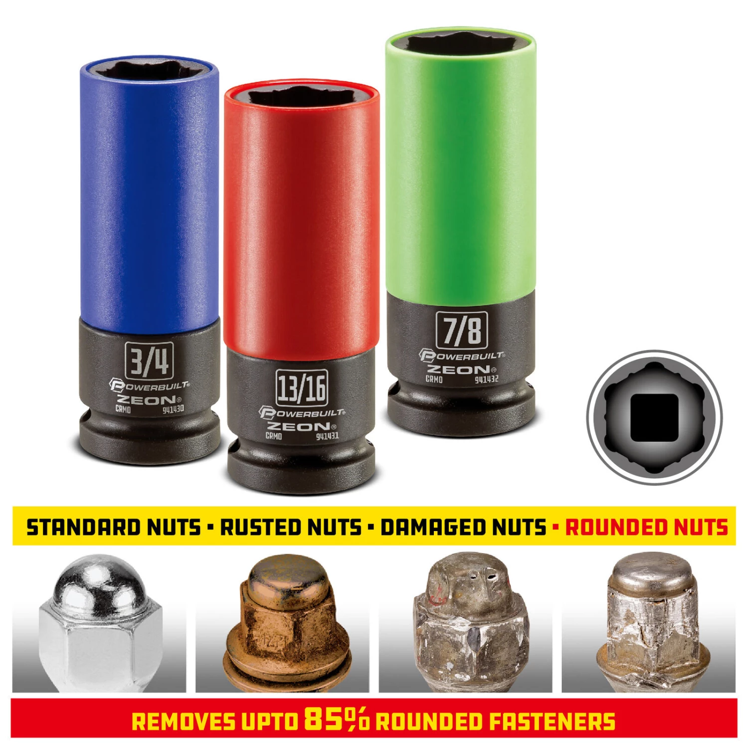 - Fix the damaged wheel lug nuts with the Powerbuilt 3-piece SAE lug nut socket set