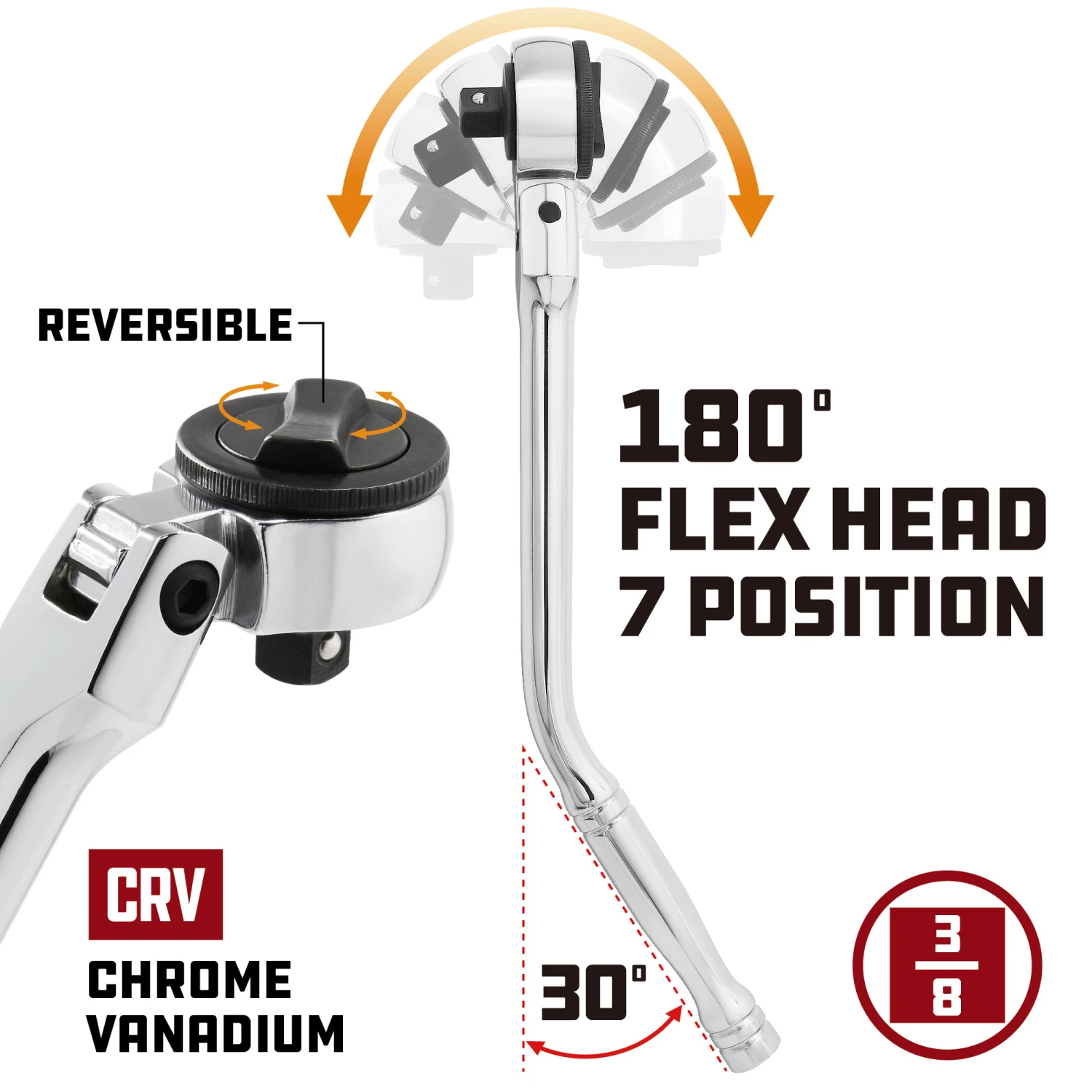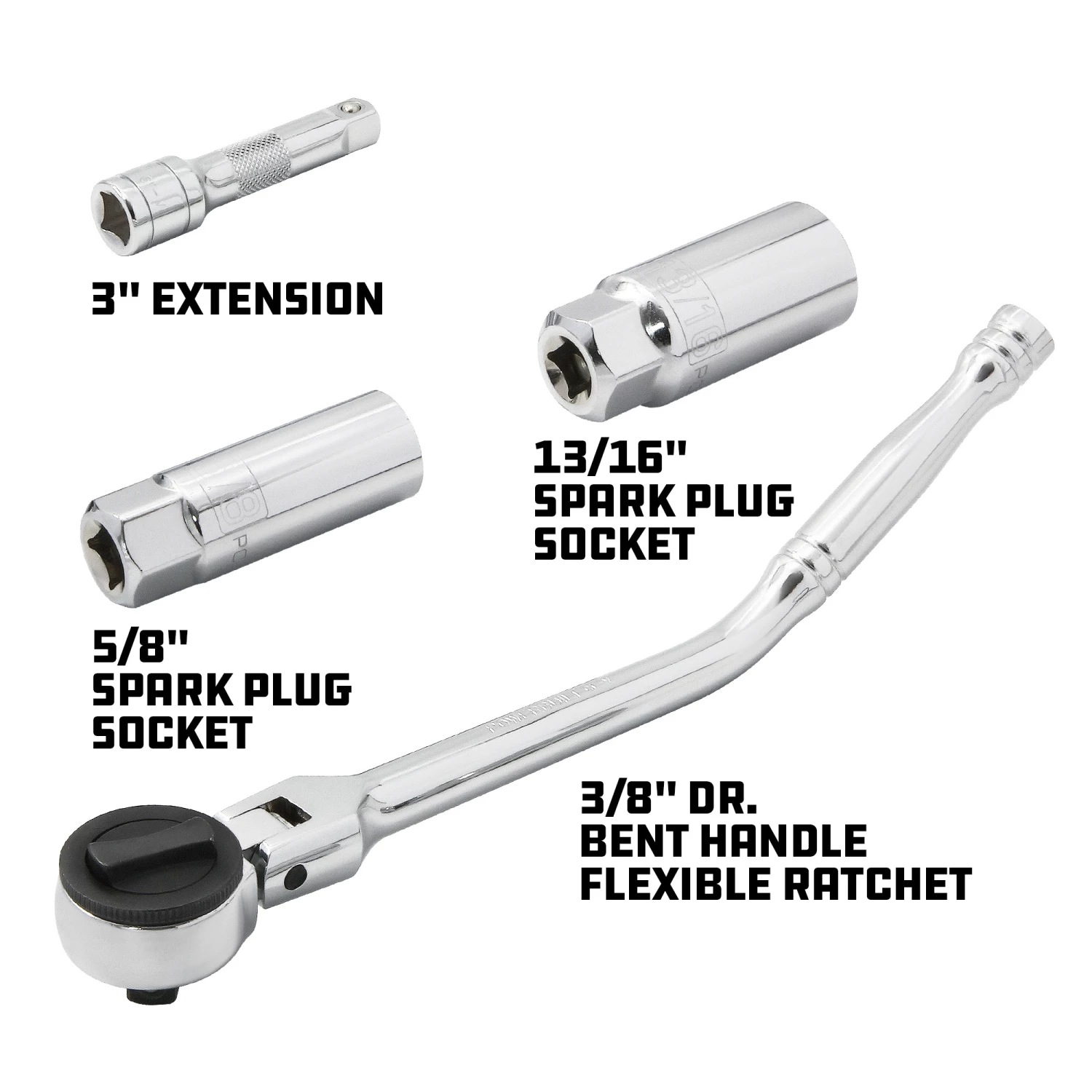-Includes 3/8″ drive bent handle ratchet, 3″ extension, 5/8″ and 13/16″ spark plug sockets