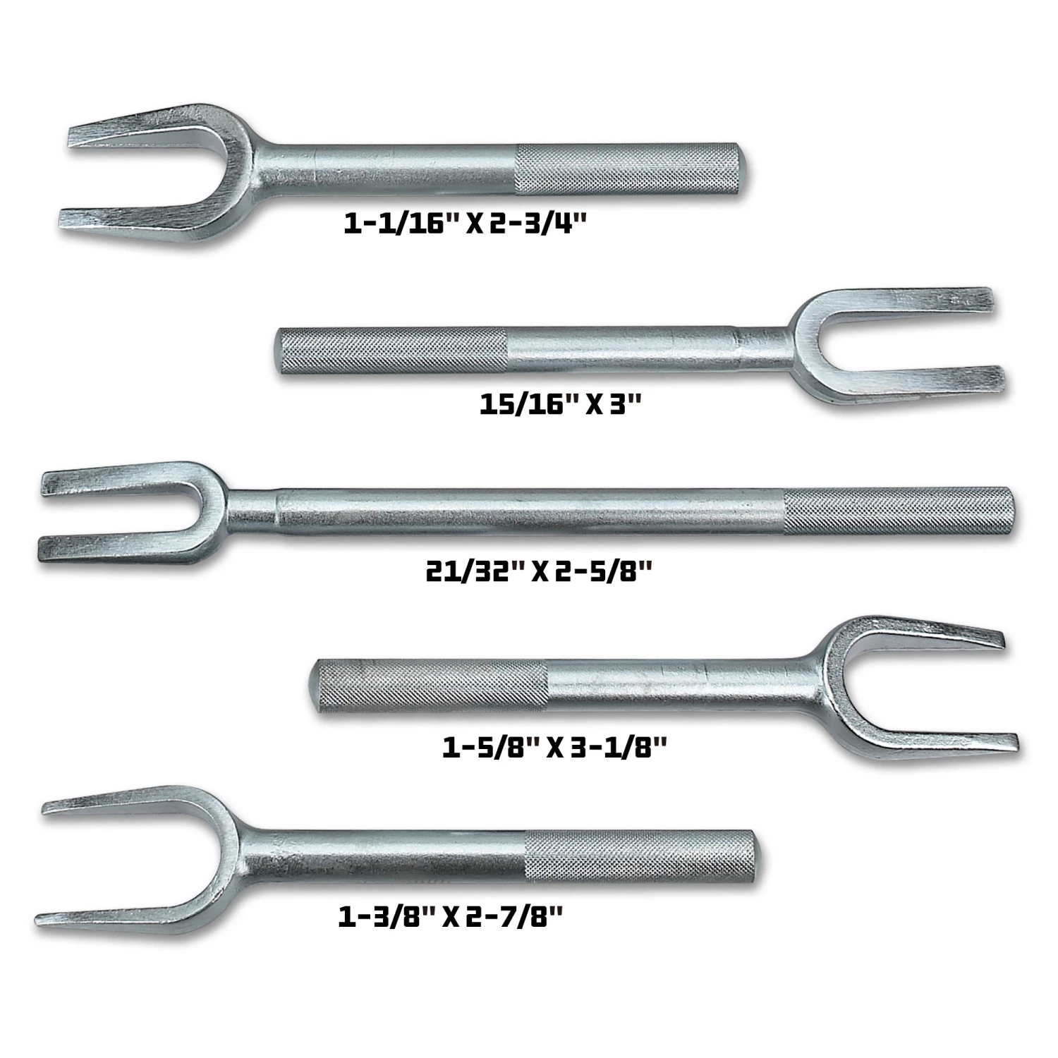 Make your life easier with the Powerbuilt 5 Piece Tie Rod/Ball Joint Separator Set. Designed to make quick easy work of separating stubborn tie rod, ball joints, and pitman arms on most passenger vehicles. Up to date coverage includes separators for Ford and GM light-duty pickup trucks. Also removes camber adjustment sleeves on light-duty Ford trucks. Simply select the right heavy-duty steel fork for your job, place the fork, and give it some muscle or a whack. Kit contains 1 1/16 inch by 2 ¾ inches fork, 15/16 inch by 3 inch fork, 21/32 inch by 2 5/8 inch fork, 1 5/8 inch by 3 1/8 inch fork, and 1 3/8 inch by 2 7/8 inch fork. All forks have knurled handle ensuring a firm secure grip. Kit Includes heavy duty carry case with usage photos and detailed instructions.