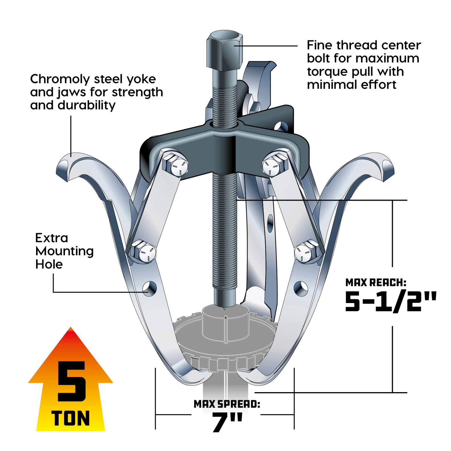 Servicing old gears and pulleys can be complicated and frustrating without the right tool. You need a tool that simplifies the task at hand. The Powerbuilt 6 Inch Combination 2/3 Reversible Jaw Gear Puller is a tough, versatile tool for pulling gears, pulleys, and many other “pressed on” components. With a 5 ton capacity and reversible three-jaw design for inside or outside pulls, it has a maximum reach of 6 inches and a 6-1/4 inches max spread. This kit can be used in either the two or three jaw configuration, adding to its versatility. Jaws reverse for inside or outside pulls and reverse end-to-end for different depths of pulls and different sized hooks. This tool features Chrome and a black oxide finish. Kit includes 9/16 inch by 7-inch national fine center bolt, combination yoke, three jaws, six 1-1/4 inch shoulder bolt and nut sets, and six elbow plates. The kit comes in a heavy-duty carry case with usage photos and Detailed instructions.