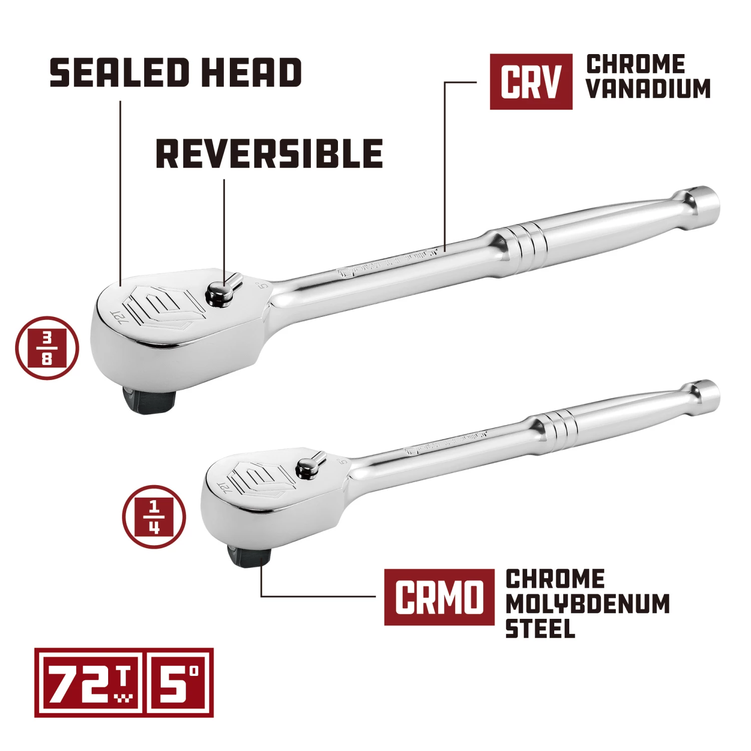 -Includes chrome vanadium 72 tooth sealed head ratchets, spinner handle, extension bars, standard and deep well SAE and metric sockets and assorted screwdriver bits in a handy storage case