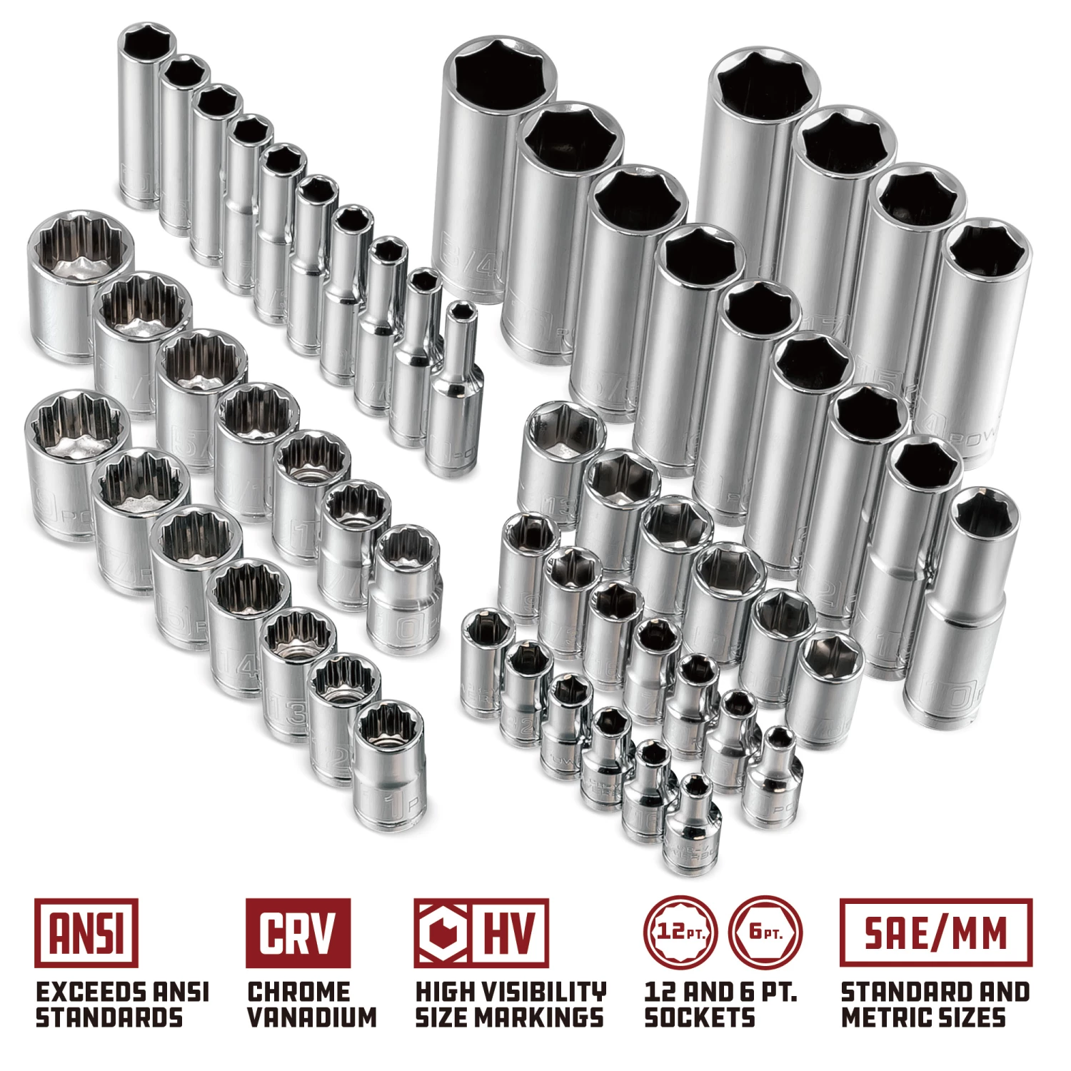 The Powerbuilt 80 Piece 1/4″ and 3/8″ Drive SAE and Metric Socket Set is a great addition to pro and serious home mechanic tool collections. It offers great coverage of the most popular ¼ inch and 3/8 inch drive sockets in shallow and deep styles in both SAE and metric sizes. Strong as well as beautiful, Powerbuilt sockets are constructed of premium chrome vanadium steel. They feature jumbo high-visibility size markings that are forged right into each socket sidewall so they’ll never fade or wear off.Built of strong chrome vanadium steel with a beautiful mirror finish, the 72-tooth ratchet features a stylish full-length spiral-machined handle that keeps your grip from slipping while you work. The fully sealed head keeps lubricant in and debris out for longer service intervals. Dependable Powerbuilt tools meet or exceed ANSI standards and have a lifetime warranty, all at affordable prices.