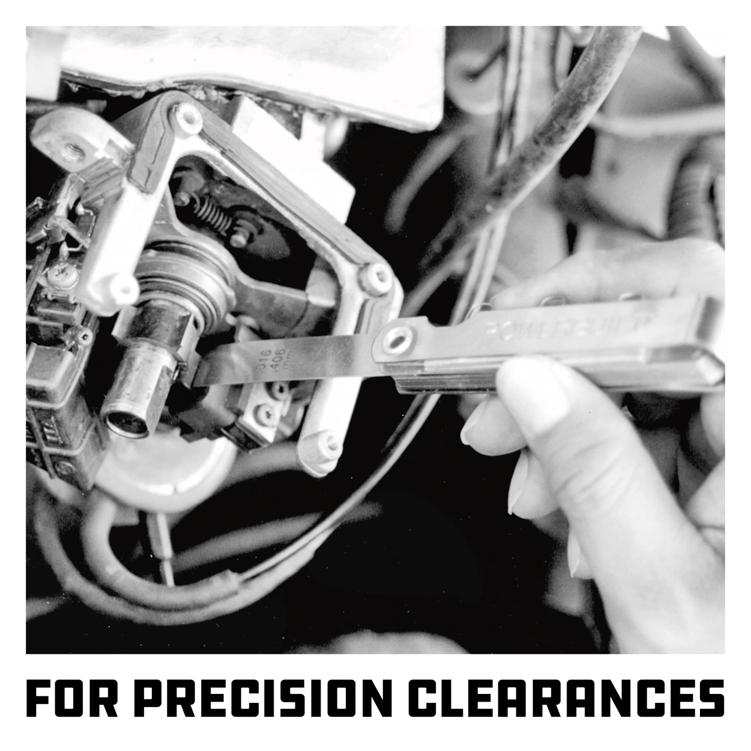 For measuring clearances from 0.002 to 0.025″ (0.051 to0.635mm). Gauge includes 9 steel blades and a 2″ steelruler. Blades include: 0.002, 0.003, 0.004, 0.005, 0.006,0.008, 0.020, 0.022, 0.025. Metric and standardmeasurements on blades. Meets Fed Spec. GGG-G-17c.