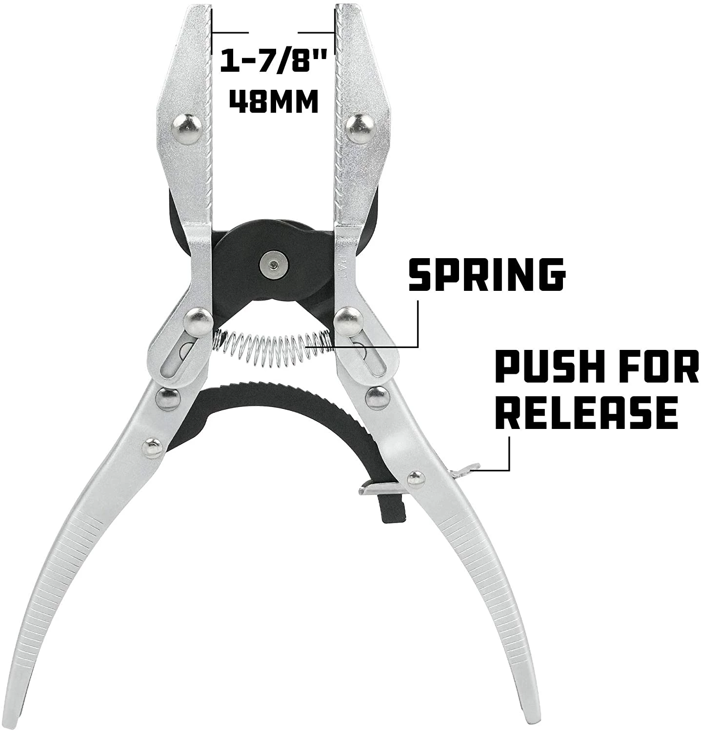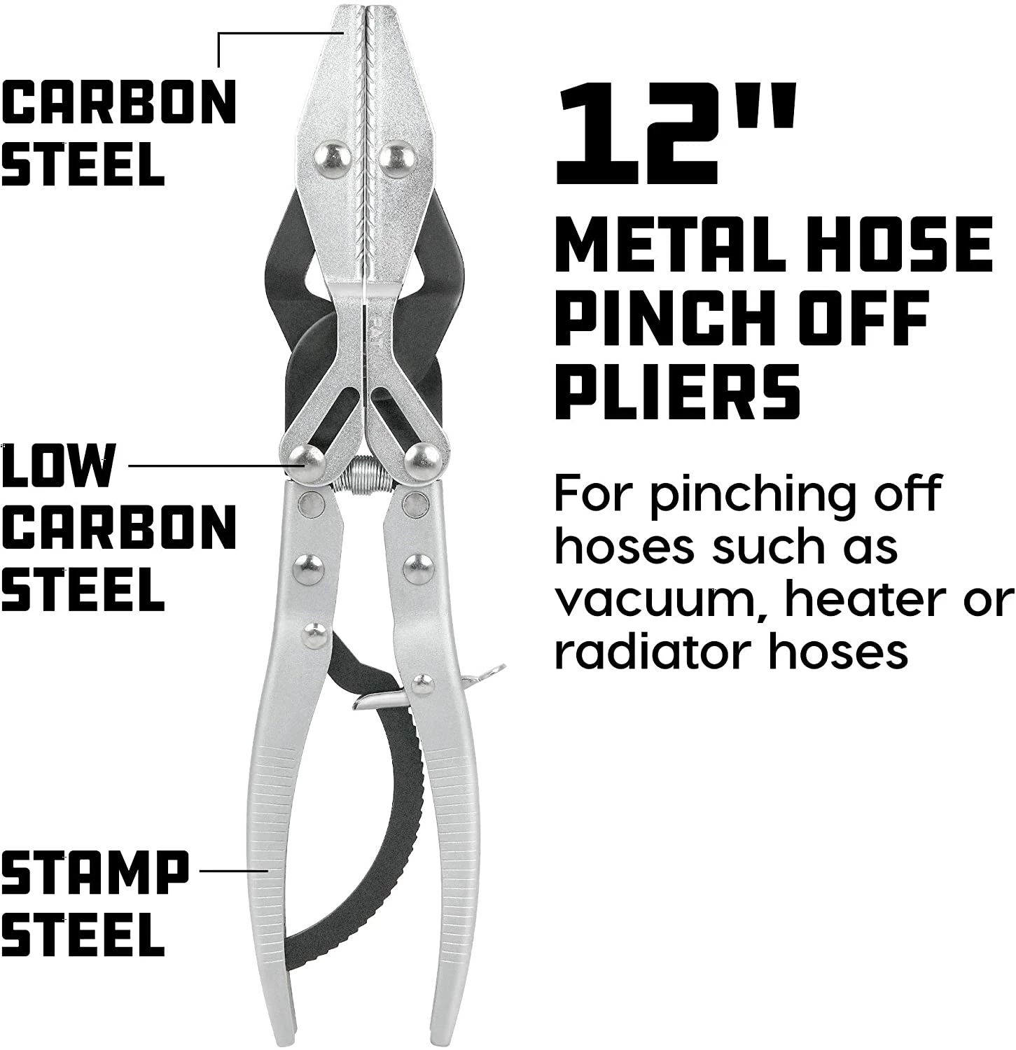 Powerbuilt 12″ hose pinch pliers are made from durable steel construction with ratcheting locking pliers designed to clamp and hold hose lines in the engine of most automobiles. The 12″ jaws allow these pliers to be used on a variety of different hose lines such as radiator, vacuum, and heater hoses. For pinching off hoses such as vacuum, heater, or radiator hoses. Meets or exceeds ANSI standards. Lifetime Warranty. -Length: 12-7/8″ -Material: Low Carbon Steel for Rivet, Stamp Steel For Handle, Carbon Steel for Jaw -Clamps and holds until release lever is pressed -Perfect for clamping and holding automobile hoses
