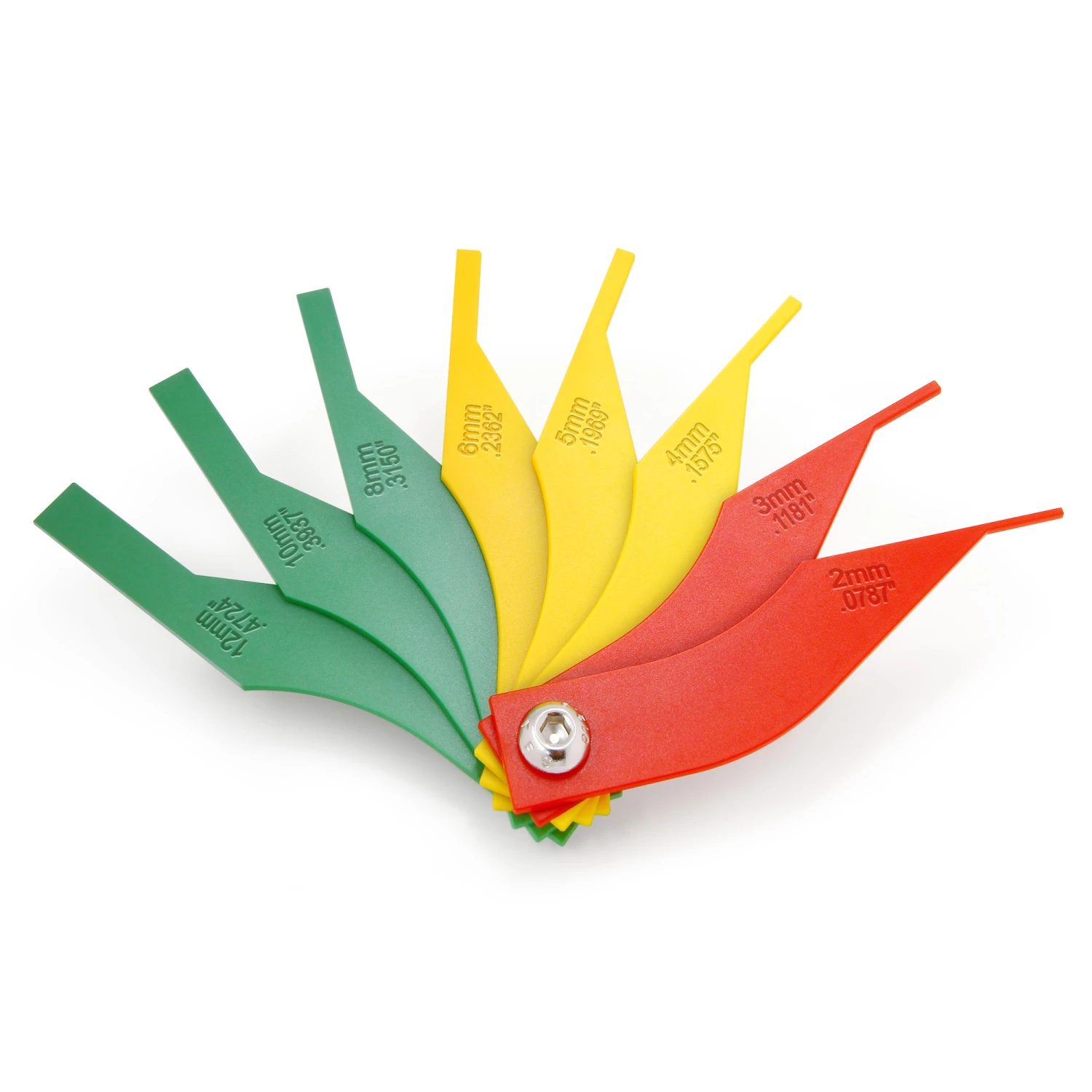 This Light weight and Accurate brake pad lining thickness gauge is the perfect tool for checking brake pads and to easily tell when maintenance is needed. The tool has 8 color coded gauge fins that range in thickness measurements from 2mm – 12mm. The gauge tool is assembled with a heavy duty rivet keeping all of the gauge fins neatly organized like a deck of cards. Simply fold out the size you want to use and hold it up to the pad in between the top opening or side of the caliper.