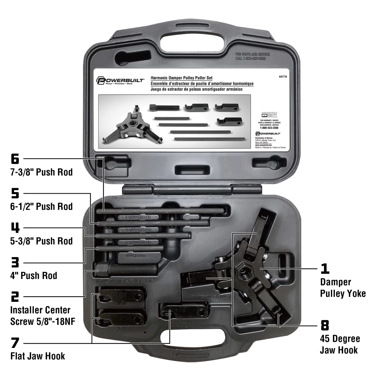 Removing a damaged or stubborn harmonic damper pulley is made easy with the Powerbuilt Harmonic Damper Pulley Puller Kit. This kit is essential for removing harmonic damper pulleys requiring jaw-type pullers from the crankshaft without damaging vital engine components. This kit fits damper pulleys found on most automotive and light truck applications. The Harmonic Damper Pulley Puller Kit comes with everything you need, including a jaw-type puller, multiple hooks, and push pins. Easy enough for the weekend mechanic, durable enough for the pros. Full detailed instructions and usage photos are included in the durable organizing case