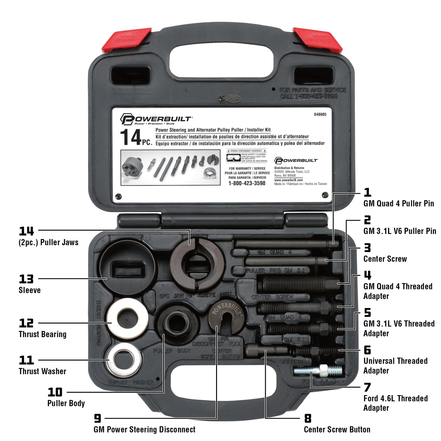 Power steering and alternator pulley servicing is made simple with the Power Steering and Alternator Pulley Puller / Installer Kit. Easy to use and tough enough for professional use, this innovative kit is the right tool for your job. It contains a versatile array of top-quality tools, installer adapters, pulley assembly with thrust bearing, jaw and sleeve, and GM power steering disconnect tool. Including special adapters for GM Quad 4, 3.1L, and Ford 4.6L modular engine pulleys. All Powerbuilt installer kits meet or exceed ANSI and/or ASME standards. Built strong enough to last a lifetime.
