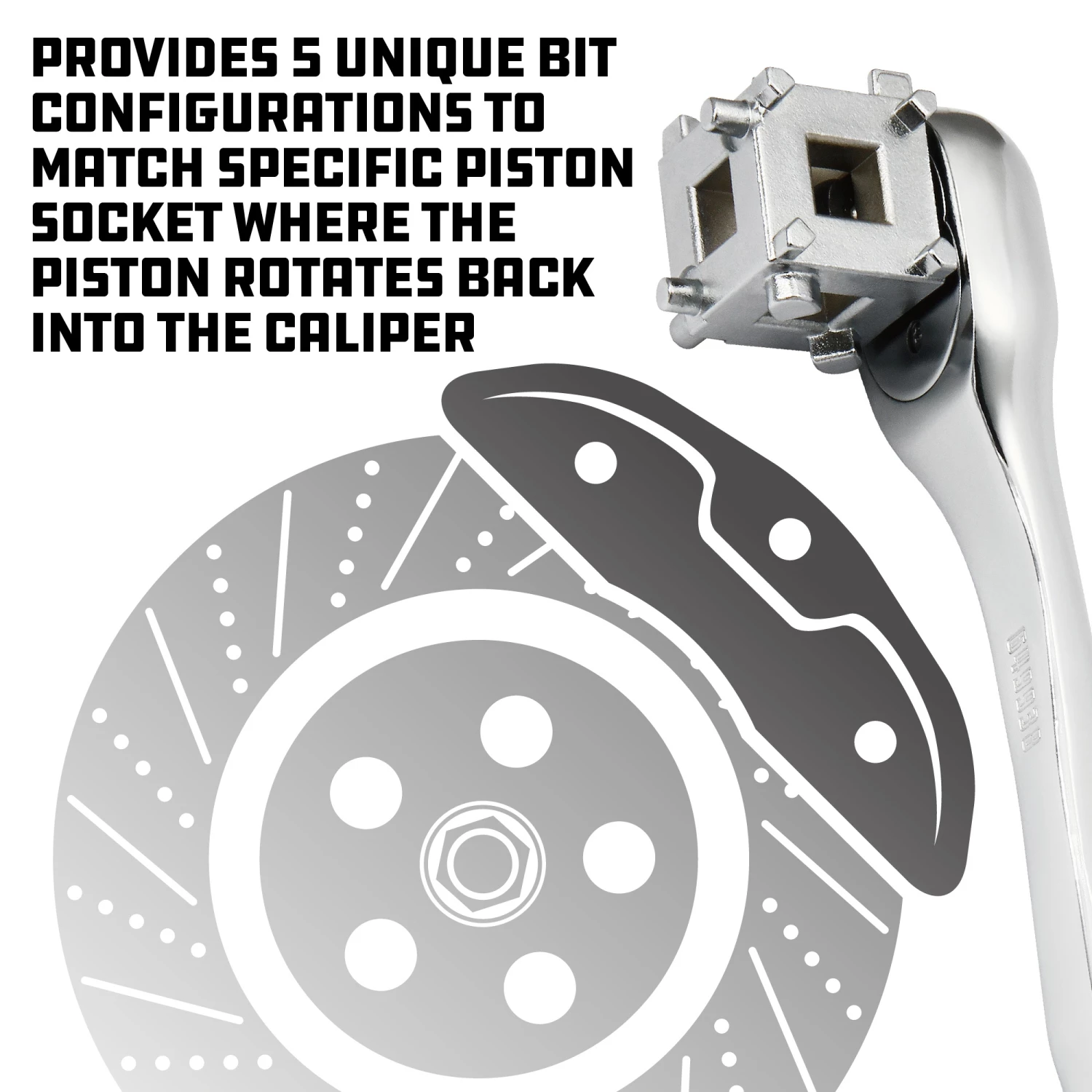 This handy little cube attaches to a 3/8″ drive tools to rotate the brake piston back into the cylinder bore to allow installation of new brake pads without disturbing parking brake adjustment. For rear disc brakes on vehicles where an automatic adjusting parking brake mechanism is part of the disc brake caliper. Tool provides 5 unique bit configurations to engage the caliper piston. Use with 3/8-inch drive ratchet or bar (not included). Meets or exceeds ANSI standards.