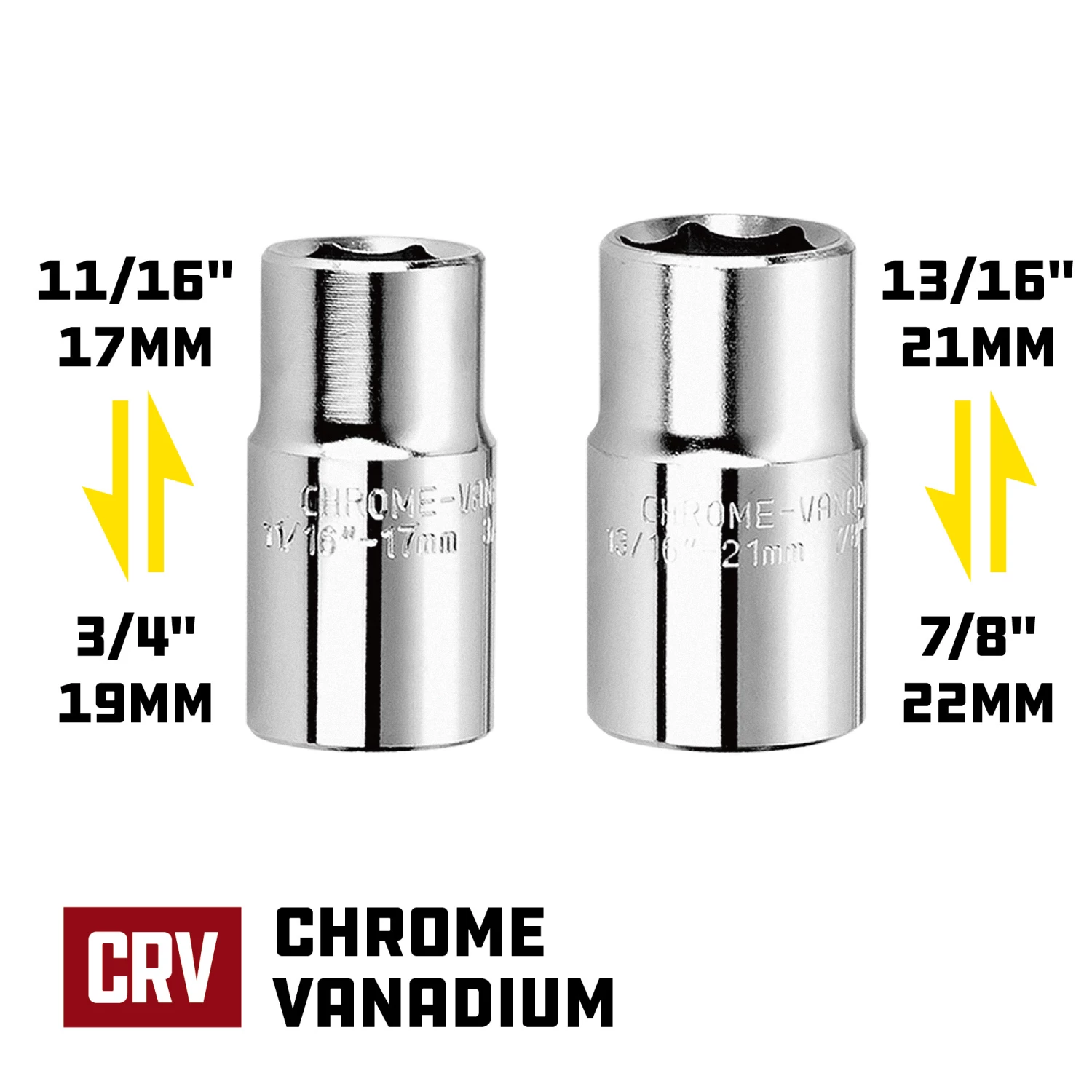-Universal sockets fit SAE lug nuts: 11/16″, 3/4″, 13/16″ 7/8″.