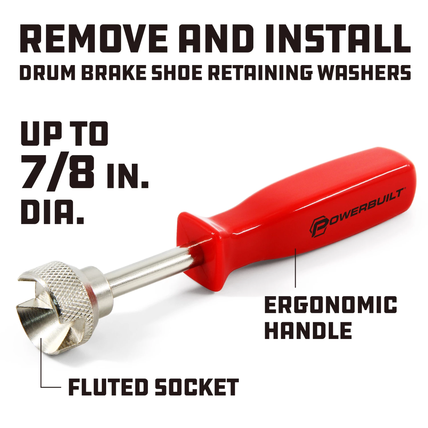 Makes it easy to remove and install drum brake shoe retaining spring washers up to 7/8-inch diameter. Fluted socket grips the retaining washer when tool is pushed in and turned. Meets or exceeds ANSI standards. Lifetime factory warranty