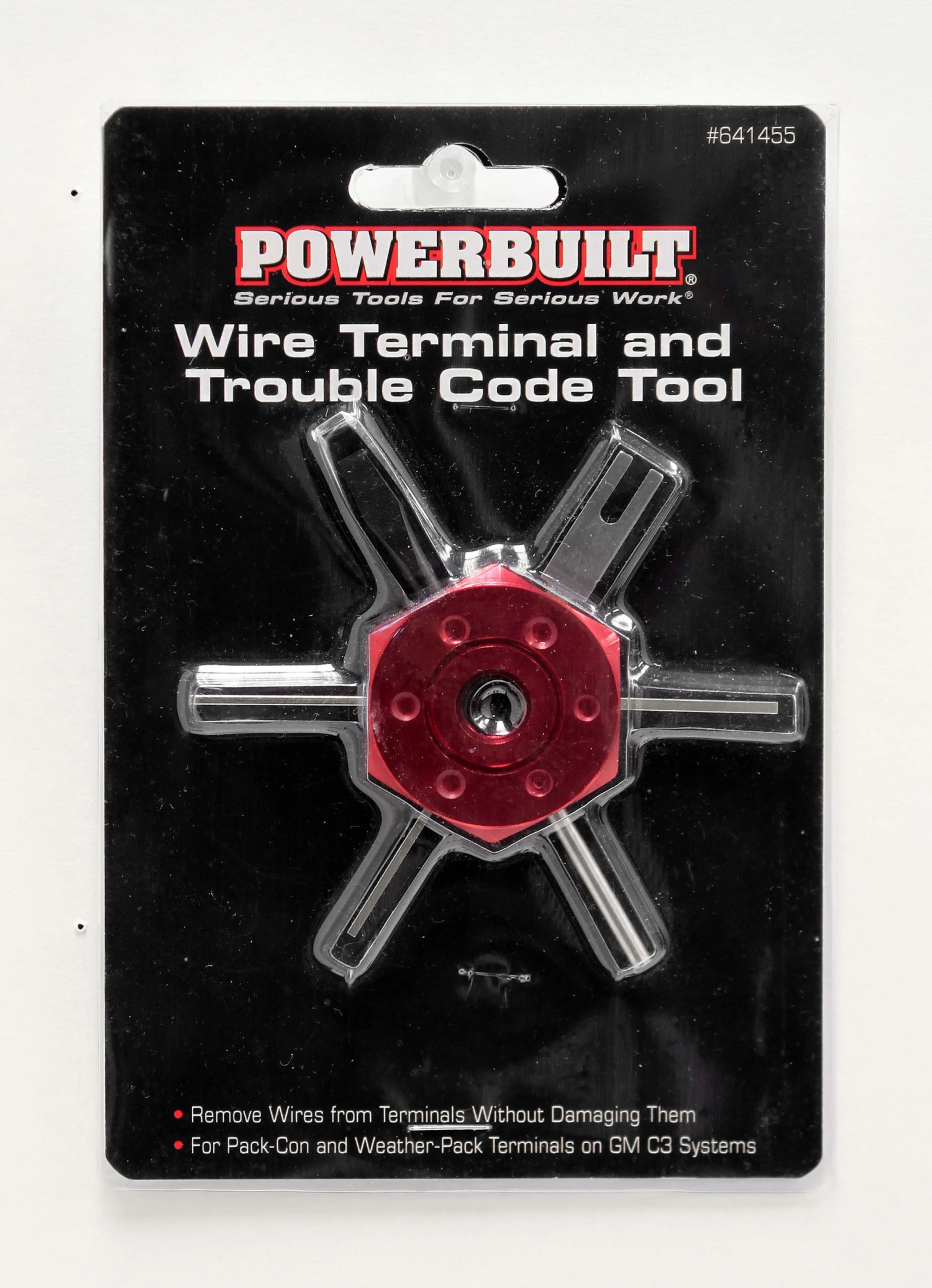The Powerbuilt Wire Terminal & Trouble Code Tool safely removes wires from terminals without damage. This versatile little tool is designed for Pack-Con and Weather-Pack on GM C3 systems and can also retrieve trouble codes from engine computers on some GM vehicles. Like other Powerbuilt tools, this wire retrieving tool makes quick work of the task at hand.Any specialty tool will help make an automotive repair or maintenance task easier, but Powerbuilt products take the concept of ‘help’ a big step further. Every package comes with professionally written usage instructions that take you step by step through proper tool usage.